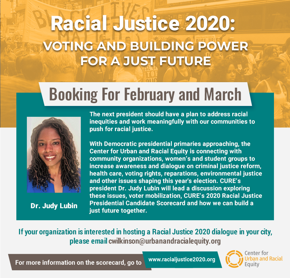 Event Description: During the last decade voting rights were gutted and police killings of Black people sparked the Black Lives Matter movement and the beginning of important criminal justice reforms. It also brought the election of the first Black president followed by a Donald Trump presidency that is openly advancing a white nationalist vision of America that targets people of color, immigrants, Muslims, women, and LGBTQ people with policies that violate our rights, reinforce white supremacy and rollback efforts to advance racial justice. The next president must be willing to articulate a clear vision for racial justice that counters the conservative’s white identity agenda that is harming Black and Brown communities and that threatens to define the new decade. The Center for Urban and Racial Equity’s 2020 Racial Justice Presidential Scorecard encapsulates key components of this vision for equity and justice and tracks and scores the major candidates’ policy positions on voting rights, health care, education, reparations, environmental justice, criminal justice, immigration and other issues to help voters make an informed decision ahead of this year’s pivotal election. Join the Center for Urban and Racial Equity’s Dr. Judy Lubin for a dialogue on these issues, voter mobilization, CURE’s Presidential Scorecard and how we can build a just future together.